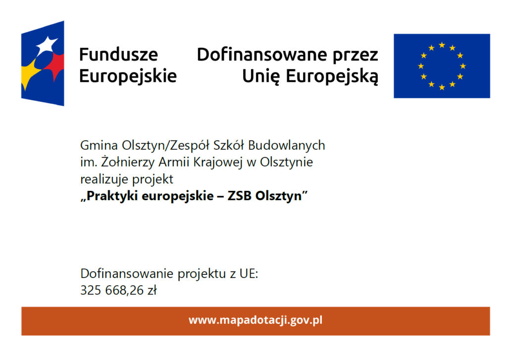 Zapraszamy do zapoznania się z regulaminem oraz niezbędnymi dokumentami, a także do wzięcia udziału w rekrutacji do projektu „Praktyki europejskie – ZSB Olsztyn”, realizowanego przez Zespół Szkół Budowlanych im. Żołnierzy Armii Krajowej w Olsztynie ze środków Unii Europejskiej w ramach programu Fundusze Europejskie dla Rozwoju Społecznego 2021–2027, współfinansowanego z Europejskiego Funduszu Społecznego Plus.